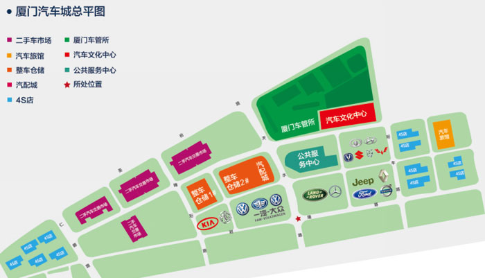 厦门汽车城目前是一边园区各4S店、二手车登记服务中心等项目正常对外营业,厦门汽车城标识设计,一边是公共服务中心及其他 4S店正处于施工期以及文化中心将要二次装修施工和对外招商中,厦门车管所装修收尾阶段,营业项目和施工项目相互交叉,造成园区环境凌乱,商业氛围较差的现状。