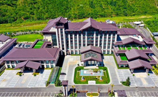 庄普酒店就藏在这一片群山环绕下的山谷中,4万余平米的新中式建筑群由国内知名设计师精心规划打造。